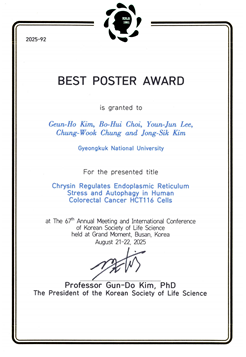 대학원 생물학과 석박사통합과정에 재학중인 김근호 학생(지도교수 김종식)은 지난 8월 21일에서 22일까지 부산 그랜드모먼트에서 개최된 “2025년도 한국생명과학회, 제67회 국제학술대회”에서 최우수 포스터 발표상을 수상하였다. 발표 논문 제목은 “Chrysin Regulates Endoplasmic Reticulum Stress and Autophagy in Human Colorectal Cancer HCT116 Cells”로써, 프로폴리스나 벌꿀에 다량 함유되어 있는 천연물질 chrysin이 대장암 세포주에서 소포체 스트레스와 자가포식작용을 조절한다는 내용이다.